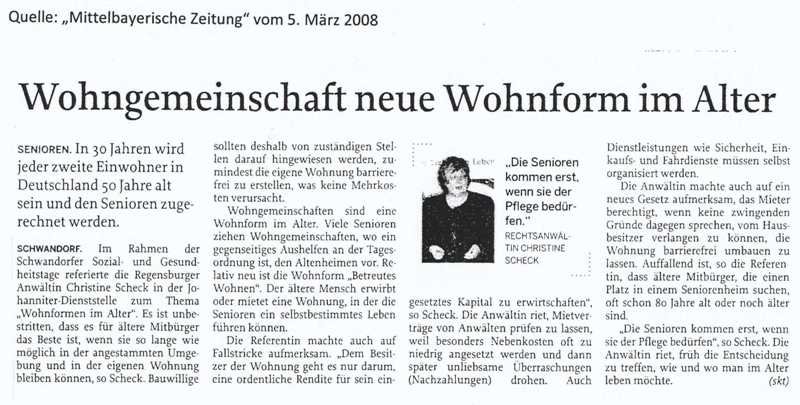 Mittelbayerische Zeitung, 05.03.2008: "Wohngemeinschaft neue Wohnform im Alter"